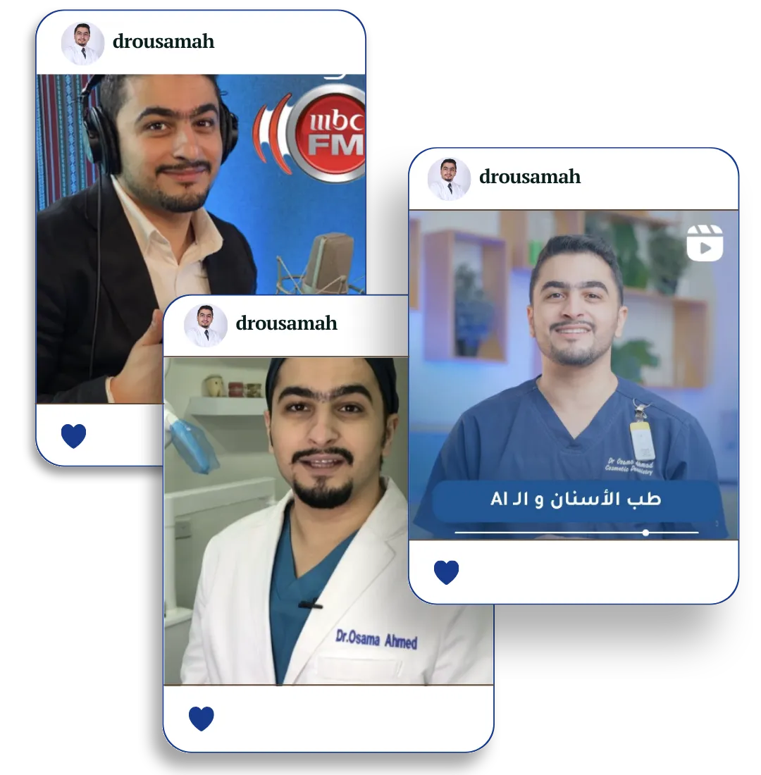 الدكتور أسامة متخصص في تجميل الأسنان، التركيبات، الزراعة الرقمية، وتصميم الابتسامة باستخدام أحدث تقنيات الذكاء الاصطناعي